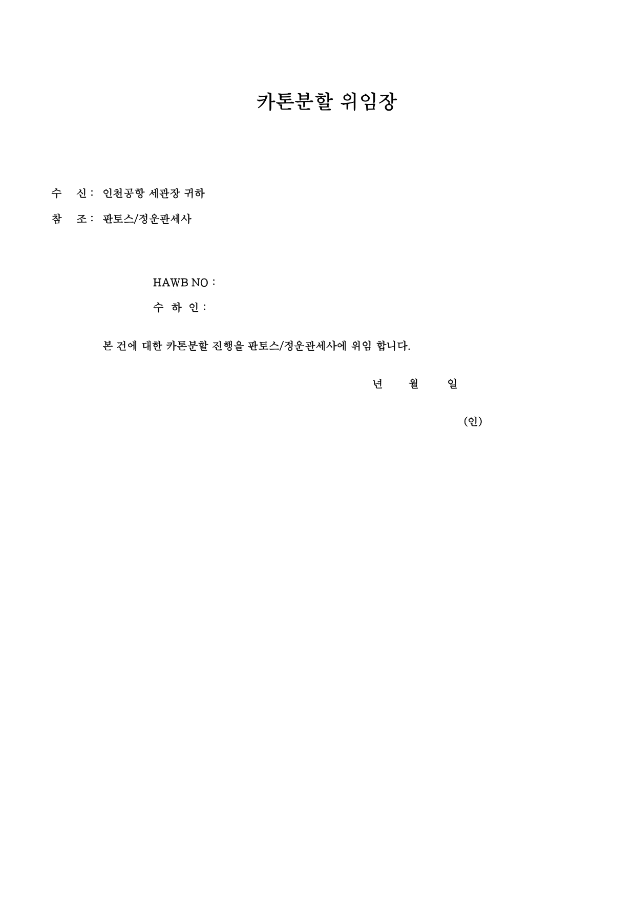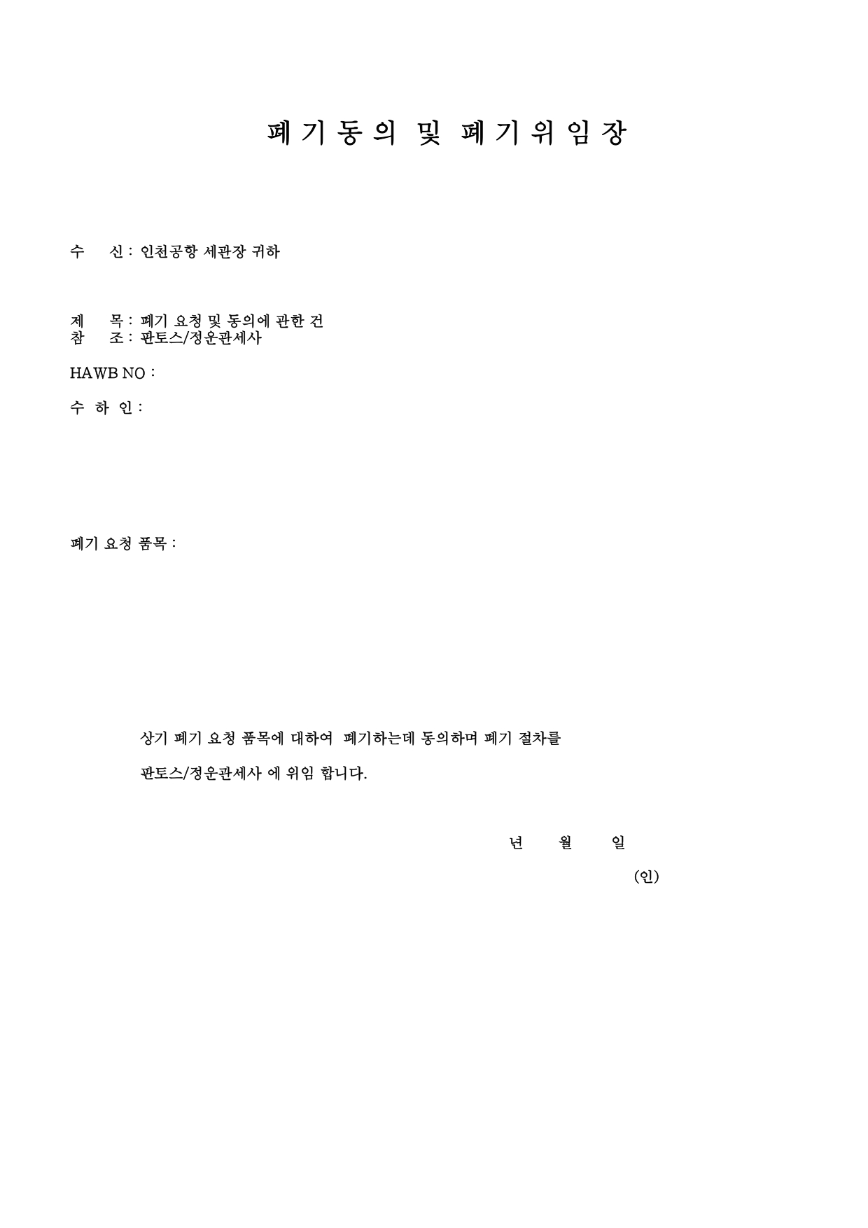 ㄴ 서류 내 [송장번호(HAWB NO)], [상품명], [수량], [본인서명] 을 작성해주세요. 해당 정보가 정확하게 기재되어야 폐기 및 통관 절차 재개가 가능합니다.